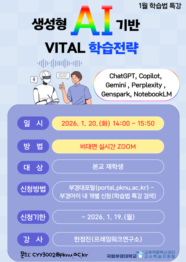 2026학년도 1월 학습법 특강을 아래와 같이 실시하오니, 관심있는 학생들의 많은 참여 바랍니다. 가. 일시: 2026. 1. 20.(화) 14:00 ~ 15:50 나. 방법: 비대면 실시간 ZOOM 다. 참여대상: 본교 학부 재학생 라. 신청방법: 부경대포털 (portal.pknu.ac.kr) - 부경 AI 접속 후 개별 신청 마. 신청기한: 2026. 1. 19.(월) 바. 특강주제: 생성형 AI 기반 VITAL 학습전략 사. 강사: 한정진(프레임워크연구소 대표)